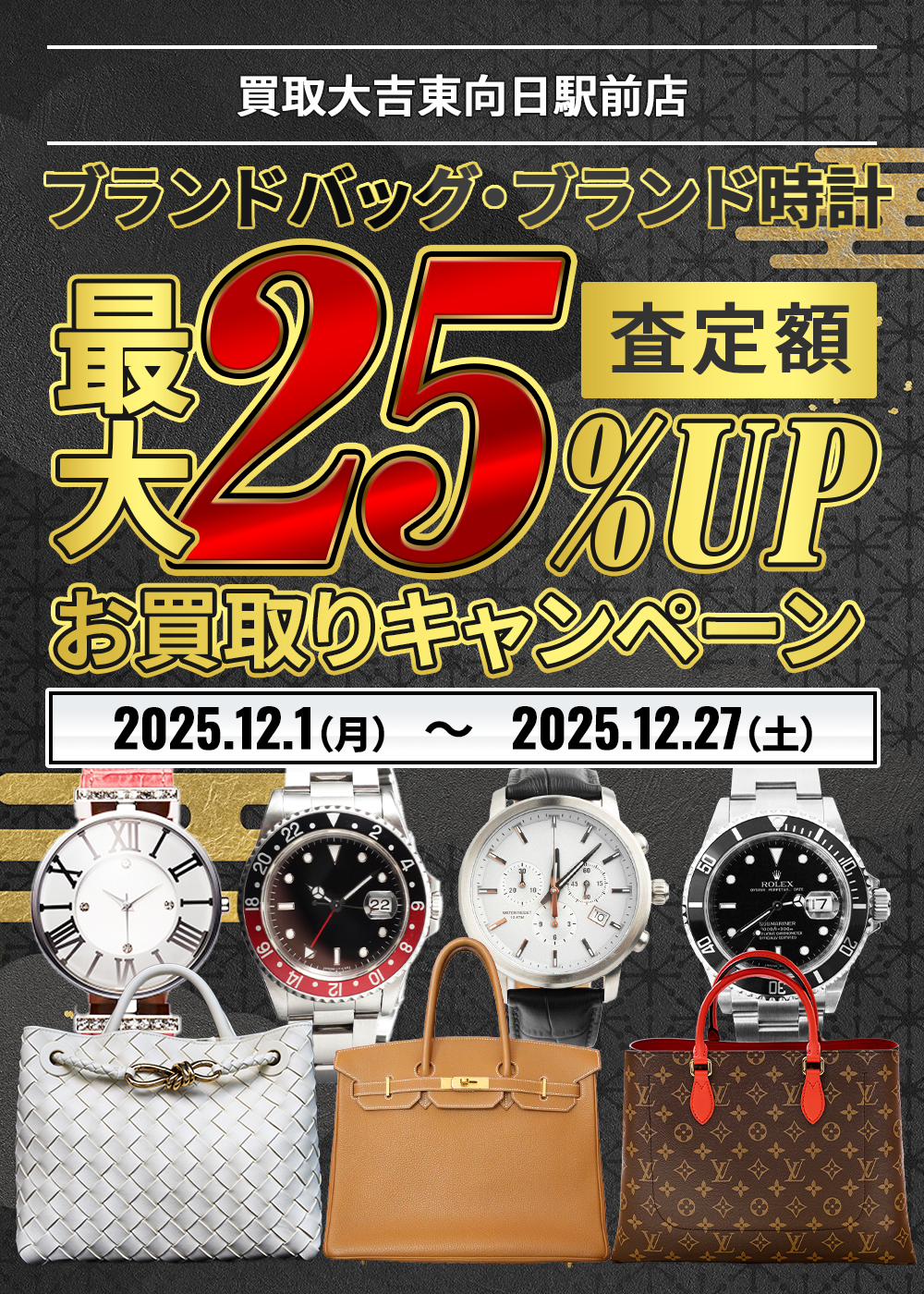 12月は、WEBをご覧の方限定で、対象アイテムの買取金額が最大25%アップする特別キャンペーンを開催いたします!